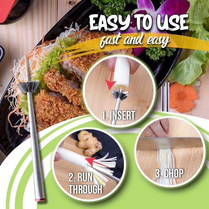 The Stainless Steel Plum Blossom Onion Cutter can easily and consistently shred various vegetable stems, such as onions, chimes, young garlic leaf, spinach, scallion, and more.